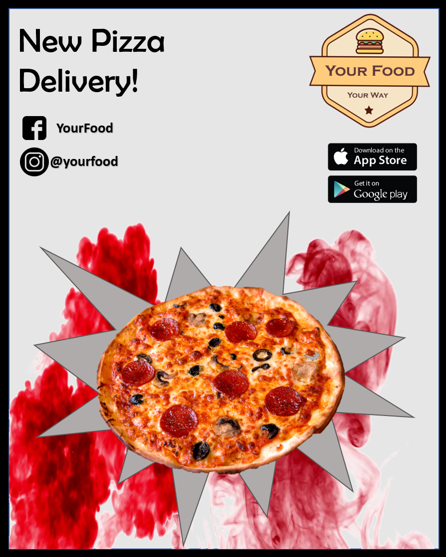 This shows one of my first adverts I made, as you can see its a very basic font, with a weird looking star thing surrounding the pizza, i have since removed that. and since then i changed where the logo and slogan are, while also changing the slogan itself. Another thing i changed was the red mist in the background, as i removed it because it looked tacky.